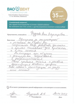 Что отличает нашу клинику? Прежде всего то, что пациенты приходят к нам по рекомендации близких и друзей, довольных результатом лечения. Являясь семейной стоматологией, "ВАО-Дент" зачастую помогает поддерживать здоровье нескольким поколениям одной семьи. Мы высоко ценим доверие и преданность пациентов, за долгие годы общения многие из них стали нашими друзьями.