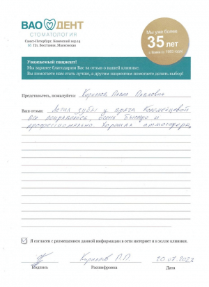 Мы поможем вам оформить документы для возврата НДФЛ, который составит 13 % от стоимости процедур. Также заблаговременно оповестим о проходящих скидках и акциях в «ВАО-Дент» в Ковенском переулке, д. 14, недалеко от Лиговского, Невского и Литейного проспектов.